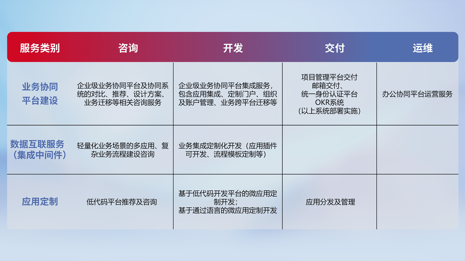 针对钉钉、、企微、、、IDaas等平台级产品提供产品的规划、、方案、、交付、、、、定制化开发等服务,,,实现如统一协同办公、、、、智能客户服务、、、混合会议管理、、、、智能数据查询、、、、等业务场景,,,,实现数字化转型。。